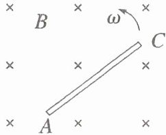 如图,当长为 $ l $ 的导体在垂直于匀强磁场(磁感应强度为 $ B $)的平面内,绕一端以角速度 $ \omega $ 匀速转动,当导体运动 $ \Delta t $ 时间后,转过的弧度 $ \theta = \omega \Delta t $,扫过的面积 $ \Delta S = $ ,则 $ E = \frac{\Delta \varPhi}{\Delta t} = \frac{B \Delta S}{\Delta t} = $ (或 $ E = Bl \overline{v} = Bl \frac{v_A + v_C}{2} = $ )。