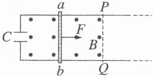 如图所示,水平绝缘桌面上固定有间距为 $ L $ 的平行光滑长导轨,左端接有一个不带电的电容器,电容为 $ C $(不会被击穿),在 $ PQ $ 虚线的左侧有竖直向上的匀强磁场,磁感应强度大小为 $ B $。质量为 $ m $ 的金属杆 $ ab $ 静置在导轨上,与虚线 $ PQ $ 的距离是 $ d $,金属杆在水平向右恒力 $ F $ 的作用下,开始向右运动,不计导轨与金属杆的电阻,金属杆 $ ab $ 始终与导轨垂直且接触良好,