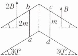 如图,两条“^”形的光滑平行金属导轨固定在绝缘水平面上,间距为 $ L $,左、右两导轨面与水平面夹角均为 $ 30^{\circ} $,均处于竖直向上的匀强磁场中,磁感应强度大小分别为 $ 2B $ 和 $ B $。将有一定阻值的导体棒 $ ab $、$ cd $ 放置在导轨上,同时由静止释放,两棒在下滑过程中始终与导轨垂直并接触良好,$ ab $、$ cd $ 的质量分别为 $ 2m $ 和 $ m $,长度均为 $ L $。导轨足够长且电阻不计,重力加速度为 $ g $,两棒在下滑过程中(