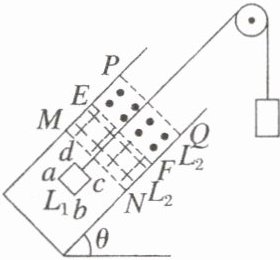 如图所示,粗细均匀的正方形导线框 $ abcd $ 放在倾角为 $ \theta = 30^{\circ} $ 的绝缘光滑斜面上,通过轻质细线绕过光滑的轻质定滑轮与木块相连,细线和线框共面、与 $ cd $ 垂直且与斜面平行。距线框 $ cd $ 边为 $ L_0 $ 的矩形 $ MNQP $ 区域存在着垂直于斜面、大小相等、方向相反的两个匀强磁场,$ EF $ 为两个磁场的分界线,$ ME = EP = NF = FQ = L_2 $。现将木块由静止释放后,木块下降,线框沿斜面上滑,恰好匀速进入和匀速离开匀强磁场,$ cd $ 边始终平行磁场边界 $ MN $。已知线框边长为 $ L_1 (L_1 \lt L_2) $、质量为 $ m $、电阻为 $ R $,木块质量也为 $ m $,重力加速度为 $ g $,求: