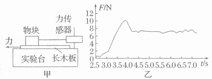 某同学利用如图甲所示的装置研究摩擦力的变化情况。水平光滑的实验台上固定着一个力传感器,力传感器与一质量为3.5kg的物块用水平轻绳连接,物块放置在粗糙的长木板上。水平向左拉长木板,力传感器记录的F-t图像如图乙所示。重力加速度大小g取10m/s²,下列说法正确的是(