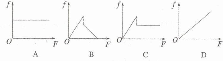 1. 如图所示,一木箱放在水平地面上,现对木箱施加一斜向上的拉力F,保持拉力的方向不变,在拉力F的大小由零逐渐增大的过程中。关于摩擦力f的大小随拉力F的变化关系,下列选项图可能正确的是(