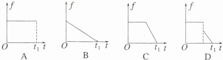 如图所示,用水平力F拉着一物体在水平地面上做匀速直线运动,从t=0时刻起水平力F的大小随时间均匀减小,到t₁时刻,F减小为零。物体所受的摩擦力f随时间t变化的图像可能是(