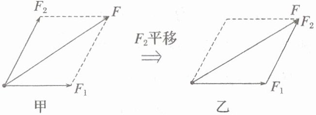 ①平行四边形定则:求两个互成角度的分力的合力,可以用表示这两个力的有向线段为作平行四边形,这两个邻边之间的就表示合力的大小和方向。如图甲所示,$F_{1}$、$F_{2}$为分力,$F$为合力。