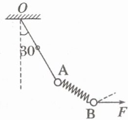 6. (来自人教教材改编)两金属小球 $ A $、$ B $ 用一轻质弹簧连接,球 $ A $ 用轻绳悬挂于 $ O $ 点,在水平拉力 $ F $ 的作用下,两小球处于如图所示的位置,此时轻绳与竖直方向的夹角为 $ 30^{\circ} $。现将力 $ F $ 逆时针缓慢转动 $ 30^{\circ} $,在此过程中,轻绳与竖直方向的夹角不变。下列说法正确的是(
