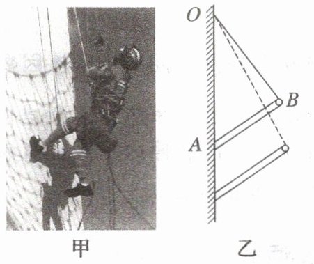 2. (2025·上海市闵行区期中)消防员下降过程中(如图甲所示),可将模型简化为如图乙所示,脚与竖直墙壁触点为 $ A $ 点,人的重力全部集中在点 $ B $,$ AB $ 可简化为轻杆,$ OB $ 可简化为轻绳。已知下降过程中 $ AB $ 的长度和 $ AB $ 与竖直方向的夹角保持不变,消防员初始时刻静止,下降一定高度后,再次静止时相对于初始位置(
