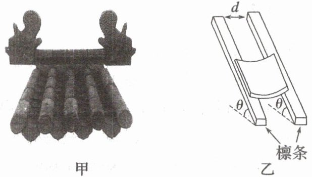 4. (2024·重庆市渝中区期中)如图甲所示,用瓦片做屋顶是我国建筑的特色之一。铺设瓦片时,屋顶结构可简化为图乙所示,建筑工人将一瓦片轻放在两根相互平行的檩条正中间,若瓦片能始终静止在檩条上。已知檩条与水平面夹角均为 $ \theta $,瓦片质量为 $ m $,檩条间距离为 $ d $,重力加速度为 $ g $,下列说法正确的是(