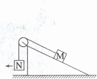 8. (多选)如图,一斜面粗糙的斜面体置于粗糙地面上,斜面顶端装有一光滑轻质定滑轮。一细绳跨过滑轮,其一端悬挂物块 $ N $,另一端与斜面上的物块 $ M $ 相连,$ M $ 与滑轮间细绳与斜面平行,系统处于静止状态。现用水平向左的拉力缓慢拉动 $ N $,直至悬挂 $ N $ 的细绳与竖直方向成 $ 45^{\circ} $。已知 $ M $ 与斜面体始终保持静止,则在此过程中(