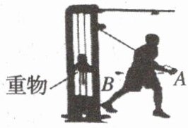 7. (2025·山西晋城市检测)如图所示,某健身者右手拉着抓把沿水平方向从图示位置 $ B $ 缓慢移动到位置 $ A $,不计绳子质量,忽略绳子和重物与所有构件间的摩擦,$ A $、$ B $、重物共面,则重物上升过程中(