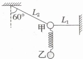 6. (八省联考·陕西·6)如图,质量均为 $ m $ 的两个相同小球甲和乙用轻弹簧连接,并用轻绳 $ L_{1} $、$ L_{2} $ 固定,处于静止状态,$ L_{1} $ 水平,$ L_{2} $ 与竖直方向的夹角为 $ 60^{\circ} $,重力加速度大小为 $ g $。则(