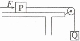5. (2021·海南卷·7)如图,两物块 $ P、Q $ 用跨过光滑轻质定滑轮的轻绳相连,开始时 $ P $ 静止在水平桌面上。将一个水平向右的推力 $ F $ 作用在 $ P $ 上后,轻绳的张力变为原来的一半。已知 $ P、Q $ 两物块的质量分别为 $ m_P = 0.5 \, kg、m_Q = 0.2 \, kg $,$ P $ 与桌面间的动摩擦因数 $ \mu = 0.5 $,重力加速度 $ g = 10 \, m/s^2 $。则推力 $ F $ 的大小为(
