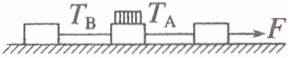 3. (多选)(2024·吉林通化市模拟)如图所示,用力 $ F $ 拉着三个物体在光滑水平面上运动,现在中间的物体上加一块橡皮泥,它和中间的物体一起运动,且原拉力 $ F $ 不变,那么加上橡皮泥以后,两段绳的拉力 $ T_A $ 和 $ T_B $ 的变化情况是(