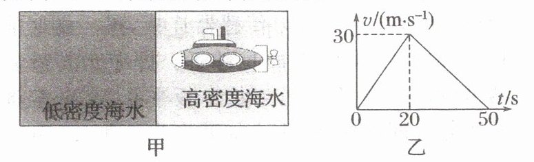 2. (2025·辽宁省七校协作体开学考)根据海水中的盐分高低可将海水分成不同密度的区域,当潜艇从海水高密度区域驶入低密度区域,浮力顿减,称之为“掉深”。如图甲所示,某潜艇在高密度海水区域沿水平方向缓慢航行。$t = 0$时,该潜艇“掉深”,随后采取措施自救脱险,在 $0~50\ s$ 内潜艇竖直方向的 $v - t$ 图像如图乙所示(设竖直向下为正方向)。不计水的黏滞阻力,则(