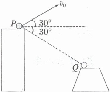 10. (多选)(2024·山东卷·12)如图所示,工程队向峡谷对岸平台抛射重物,初速度 $v_0$ 大小为 20 m/s,与水平方向的夹角为 $30°$,抛出点 P 和落点 Q 的连线与水平方向夹角为 $30°$,重力加速度大小取 10 m/s²,忽略空气阻力。重物在此运动过程中,下列说法正确的是(