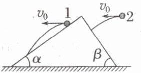 7. (2024·四川宜宾市一诊)如图所示,1、2 两个小球以相同的速度 $v_0$ 水平抛出。球 1 从左侧斜面抛出,经过时间 $t_1$ 落回斜面上,球 2 从某处抛出,经过时间 $t_2$ 恰能垂直撞在右侧的斜面上。已知左、右两侧斜面的倾角分别为 $\alpha = 30°$、$\beta = 60°$,则(
