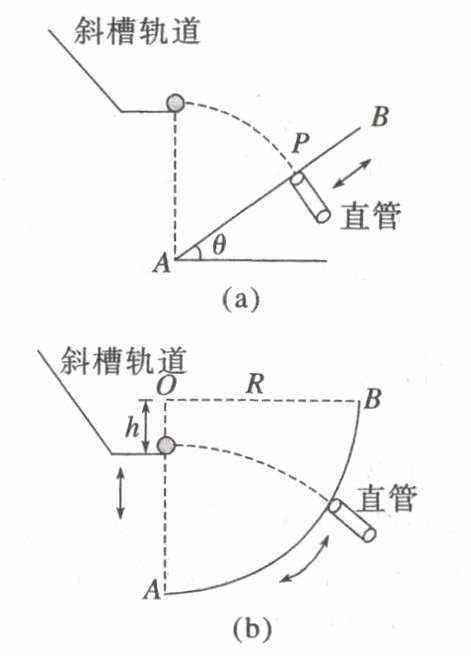 。(用 $ L $、$ g $、$ \theta $ 表示)(2)(6分)实验二:如图(b)所示,一半径为 $ R $ 的四分之一圆弧面 $ AB $,圆心为 $ O $,$ OA $ 竖直,直管保持沿圆弧面的半径方向,管口在圆弧面内,直管可以根据需要沿圆弧面移动。平抛运动实验轨道抛出口位于 $ OA $ 线上可以上下移动,抛出口至 $ O $ 点的距离为 $ h $。上下移动轨道,多次重复实验,记录每次实验抛出口至 $ O $ 点的距离,不断调节直管位置以及小球平抛初速度,让小球能够落入直管。为提高小球能够落入直管的成功率及实验的可操作性,可以按如下步骤进行:首先确定能够落入直管小球在圆弧面上的落点,当 $ h $ 确定时,理论上小球在圆弧面上的落点位置是
