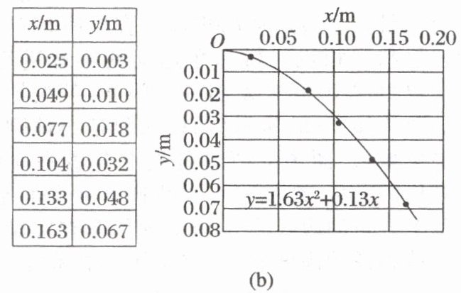 (3)设在坐标原点位置小球的水平速度为$v_0$,竖直速度为$v_{0y}$, 则根据$x = v_0t$ $y = v_{0y}t + \frac{1}{2}gt^2$ 解得$y = v_{0y} \frac{x}{v_0} + \frac{1}{2}g(\frac{x}{v_0})^2$ $= \frac{g}{2v_0^2}x^2 + \frac{v_{0y}}{v_0}x$ 对比$y = 1.63x^2 + 0.13x$ 可得$\frac{g}{2v_0^2} = 1.63$ 解得$v_0 \approx 1.7 m/s$。