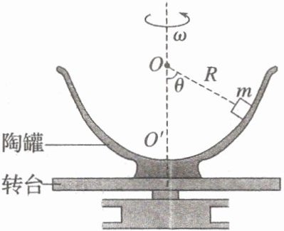 4. (来自人教教材改编)如图所示,半径为$R$的半球形陶罐,固定在水平转台上,转台竖直转轴与过陶罐球心$O$的对称轴$OO'$重合。当转台匀速转动时,观察到陶罐内壁上质量为$m$的小物块随陶罐一起转动且相对罐壁静止,它和$O$点的连线与$OO'$的夹角$\theta = 60°$。重力加速度大小为$g$。下列判断正确的是(