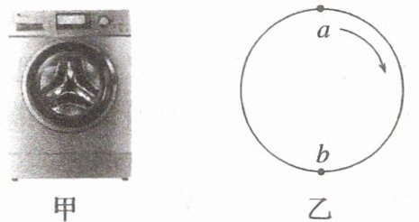 1. (2025·天津市蓟州区期末)如图甲,滚筒洗衣机脱水时,滚筒上有很多漏水孔,滚筒转动时,附着在潮湿衣服上的水从漏水孔中被甩出,达到脱水的目的,衣服紧贴着滚筒壁在竖直平面内做顺时针的匀速圆周运动。如图乙,一件可视为质点的小衣服,$a$、$b$分别为小衣服经过的最高位置和最低位置。下列说法正确的是(