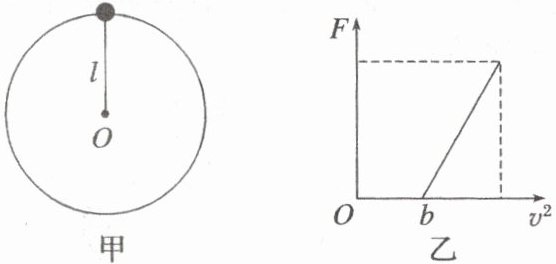 7. (多选)(2024·吉林通化市检测)如图甲所示,一长为$l$的轻绳,一端穿过$O$点的水平转轴上,另一端固定一质量未知的小球,整个装置绕$O$点在竖直面内转动。小球通过最高点时,绳对小球的拉力$F$与其速度平方$v^2$的关系如图乙所示,重力加速度为$g$,下列判断正确的是(