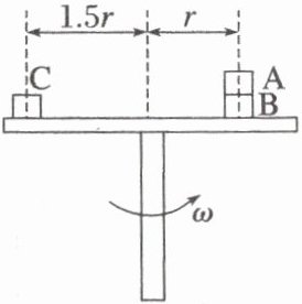 6. (2024·甘肃省民乐县诊断)如图所示,叠放在水平转台上的物体$A$、$B$及物体$C$能随转台一起以角速度$\omega$匀速转动,$A$、$B$、$C$的质量分别为$3m$、$2m$、$m$,$A$与$B$、$B$和$C$与转台间的动摩擦因数都为$\mu$,$A$和$B$、$C$离转台中心的距离分别为$r$和$1.5r$。最大静摩擦力等于滑动摩擦力,物体$A$、$B$、$C$均可视为质点,重力加速度为$g$,下列说法正确的是(