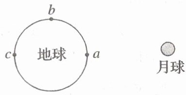2. (2024·广西卷·1)潮汐现象出现的原因之一是在地球的不同位置海水受到月球的引力不相同。图中 $a$、$b$ 和 $c$ 处单位质量的海水受月球引力大小在(