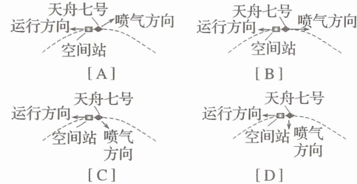 1. (2025·天津市北辰区模拟)2024年1月18日,天舟七号与空间站天和核心舱成功对接。在交会对接的最后阶段,天舟七号与空间站处于同一轨道上同向运动,两者的运行轨道均视为圆周。要使天舟七号在同一轨道上追上空间站实现对接,天舟七号喷射燃气的方向可能正确的是(