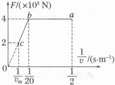 10. (多选)(2024·山东淄博市期中)电动汽车在研发过程中都要进行性能测试,如图所示为某次测试中某型号汽车在水平路面上由初速度为2 m/s开始运动,牵引力F与速度v的倒数的$ F-\dfrac{1}{v} $图像,$ v_{m} $表示最大速度,ab平行于$ \dfrac{1}{v} $轴,bc反向延长过原点。已知阻力恒定,汽车质量为$ 1×10^{3} $kg。下列说法正确的是 (