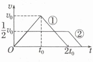 11.AC [由题图可得,变速阶段的加速度大小$a = \frac{v_{0}}{t_{0}}$,设第②次所用时间为$t_{2}$,根据速度—时间图像与时间轴所围的面积表示位移(此题中为提升的高度)可知,$\frac{1}{2} × 2t_{0} × v_{0} = \frac{1}{2} [t_{2} + (t_{2} - t_{0})] × \frac{1}{2} v_{0}$,解得$t_{2} = \frac{5t_{0}}{2}$,所以第①次和第②次矿车上升所用时间之比为$2t_{0} : \frac{5t_{0}}{2} = 4 : 5$,选项A正确;由于两次提升过程变速阶段的加速度大小相同,在匀加速阶段,由牛顿第二定律,$F - mg = ma$,可得电机的最大牵引力之比为$1 : 1$,选项B错误;由功率公式$P = Fv$可知,电机输出的最大功率之比等于最大速度之比,为$2 : 1$,选项C正确;加速上升过程的加速度$a_{1} = \frac{v_{0}}{t_{0}}$,加速上升过程的牵引力$F_{1} = ma_{1} + mg = m(\frac{v_{0}}{t_{0}} + g)$,减速上升过程的加速度$a_{2} = - \frac{v_{0}}{t_{0}}$,减速上升过程的牵引力$F_{2} = ma_{2} + mg = m(g - \frac{v_{0}}{t_{0}})$,匀速运动过程的牵引力$F_{3} = mg$。第①次提升过程做功$W_{1} = F_{1} × \frac{1}{2} × t_{0} × v_{0} + F_{2} × \frac{1}{2} × t_{0} × v_{0} = mgv_{0}t_{0}$;第②次提升过程做功$W_{2} = F_{1} × \frac{1}{2} × \frac{1}{2} t_{0} × \frac{1}{2} v_{0} + F_{3} × \frac{3}{2} t_{0} × \frac{1}{2} v_{0} + F_{2} × \frac{1}{2} × \frac{1}{2} t_{0} × \frac{1}{2} v_{0} = mgv_{0}t_{0}$,两次做功相同,选项D错误。]