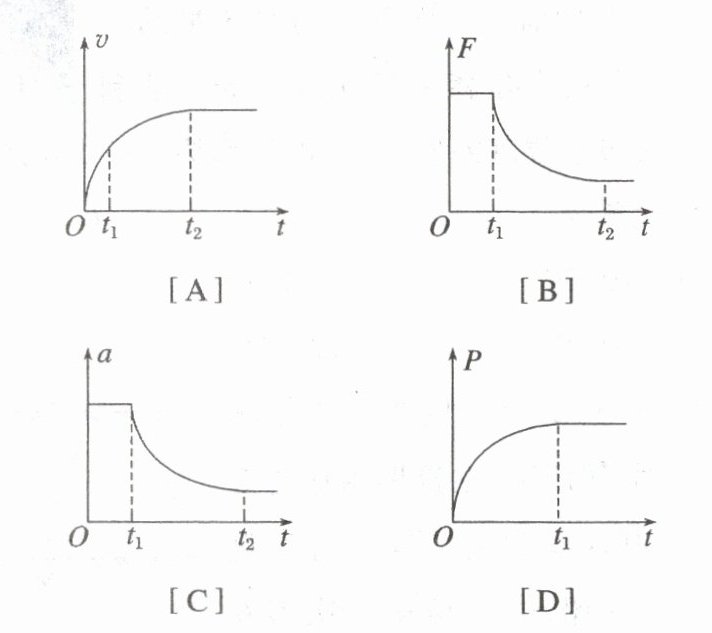 7. (2025·江苏如皋市调研)某汽车以恒定的加速度由静止开始沿平直的公路行驶,$ t_{1} $时刻达到发动机额定功率后保持功率不变,$ t_{2} $时刻起匀速行驶。汽车所受的阻力大小不变,则此过程中汽车的速度v、牵引力F、加速度a、功率P随时间t的变化规律正确的是 (