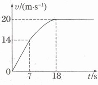 9. (2025·贵州兴义市联考)一货车前7 s内从静止开始做匀加速直线运动,7 s末货车的速率为14 m/s,功率恰好达到额定功率280 kW,7 s后货车以额定功率行驶,18 s时货车达到最大速度20 m/s,v-t图像如图所示。货车行驶时受到的阻力保持不变,g取10 $ m/s^{2} $,则货车的质量为 (