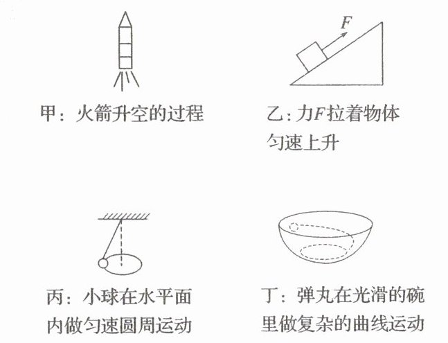 1.CD [甲图中,不论是匀速升空还是加速升空,由于推力都对火箭做正功,所以火箭的机械能都增加,故A错误;物体匀速上升,动能不变,重力势能增加,则机械能增加,故B错误;小球在做匀速圆周运动的过程中,细线的拉力不做功,机械能守恒,故C正确;弹丸在光滑的碗内做复杂的曲线运动,只有重力做功,所以弹丸的机械能守恒,故D正确。]
