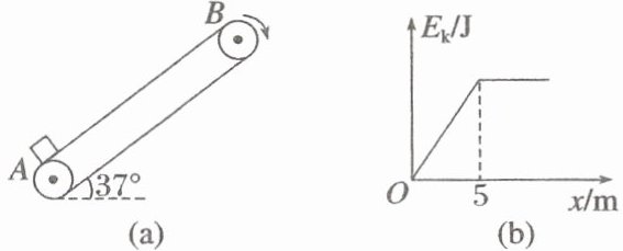 1. (2025·河北张家口市阶段测试)如图(a)所示,倾角为 $37^{\circ}$ 的传送带以 $v = 2.0\ m/s$ 的速度顺时针匀速转动,传送带的长度 $L_{AB} = 10.0\ m$。一个可视为质点的质量 $m = 1.0\ kg$ 的物块,自 $A$ 点无初速度地放在传送带底端,其被传送至 $B$ 端的过程中,动能 $E_{k}$ 与位移 $x$ 的关系 ($E_{k} - x$) 图像如图(b)所示。重力加速度 $g$ 取 $10\ m/s^2$,$\sin 37^{\circ} = 0.6$,$\cos 37^{\circ} = 0.8$。下列说法正确的是(