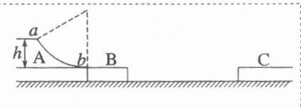 4. (16 分)(2024·海南卷·18)某游乐项目装置简化如图,$A$ 为固定在地面上的光滑圆弧形滑梯,半径 $R = 10\ m$,滑梯顶点 $a$ 与滑梯末端 $b$ 的高度差 $h = 5\ m$,静止在光滑水平面上的滑板 $B$ 紧靠滑梯的末端,并与其水平相切,滑板质量 $M = 25\ kg$,一质量为 $m = 50\ kg$ 的游客,从 $a$ 点由静止开始下滑,在 $b$ 点滑上滑板,当滑板右端运动到与其上表面等高平台 $C$ 的边缘时,游客恰好滑上平台,并在平台上滑行 $s = 16\ m$ 停下。游客视为质点,其与滑板及平台表面之间的动摩擦因数均为 $\mu = 0.2$,忽略空气阻力,重力加速度 $g$ 取 $10\ m/s^2$,求: