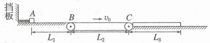 * 2. (17 分) (2025·河北邯郸市开学考) 如图所示,水平传送带的左侧轨道平面与传送带等高且相接于 $ B $ 点,传送带右侧地面上静置着一质量 $ M = 2 $ kg 的薄滑板,紧挨传送带放置,其上表面与传送带等高,在水平轨道的左侧固定着一竖直挡板,挡板连接着一劲度系数 $ k = 600 $ N/m 的水平弹簧。质量为 $ m = 1 $ kg 的物块被锁定在轨道平面上的 $ A $ 点,此时物块与挡板间的弹簧处于压缩状态,物块与弹簧不相连,现解除锁定,物块经过 $ B $ 点冲上传送带 $ BC $,此时弹簧已恢复原长。已知左侧轨道 $ AB $ 的长度 $ L_1 = 2 $ m,传送带 $ BC $ 的长度 $ L_2 = 4 $ m,滑板的长度 $ L_3 = 3.96 $ m,物块与左侧轨道平面、传送带、滑板间的动摩擦因数分别为 $ \mu_1 = 0.2 $、$ \mu_2 = 0.25 $、$ \mu_3 = 0.4 $,滑板、物块与地面间的动摩擦因数分别为 $ \mu_4 = 0.1 $、$ \mu_5 = 0.12 $,传送带顺时针匀速转动的速度 $ v_0 = 8 $ m/s,物块刚冲上传送带时的速度 $ v_B = 4 $ m/s,重力加速度 $ g $ 取 $ 10 $ m/s²,弹簧的弹性势能 $ E_p = \frac{1}{2}kx^2 $ (其中 $ k $ 为弹簧的劲度系数,$ x $ 为弹簧的形变量)。