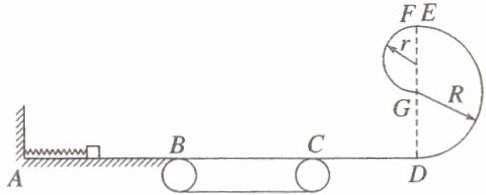 * 1. (15 分) (2025·广东佛山市联考) 如图,水平轨道 $ AB $ 的左端有一压缩的水平弹簧,其储存有弹性势能,弹簧左端固定,右端放一个质量为 $ m = 1 $ kg 的物体 (可视为质点),物体与弹簧不粘连,物体离开弹簧时速度为 $ v = 4 $ m/s,传送带 $ BC $ 的长为 $ L = 1 $ m。$ CD $ 为水平轨道,$ DE $、$ FG $ 是竖直放置的两个半径分别为 $ R = 0.4 $ m 和 $ r = 0.2 $ m 的半圆轨道,$ AB $、$ BC $、$ CD $、$ DE $、$ FG $ 均平滑连接。已知物体与传送带间的动摩擦因数 $ \mu = 0.2 $,其余轨道均光滑,$ g $ 取 $ 10 $ m/s²,不计空气阻力。