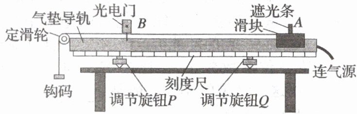 4. (8 分)(2024·天津市蓟州区期末)某同学利用如图所示的实验装置验证机械能守恒定律。将气垫导轨固定在水平桌面上,调节旋钮使其水平,在气垫导轨的左端固定一光滑的定滑轮,在 $ B $ 处固定一光电门,测出滑块及遮光条的总质量为 $ m $,将质量为 $ M $ 的钩码通过细线与滑块连接。打开气源,滑块从 $ A $ 处由静止释放,宽度为 $ d $ 的遮光条经过光电门 $ B $ 时挡光时间为 $ t $,$ A $、$ B $ 之间的距离为 $ l $,实验中钩码始终未与地面接触,重力加速度为 $ g $。