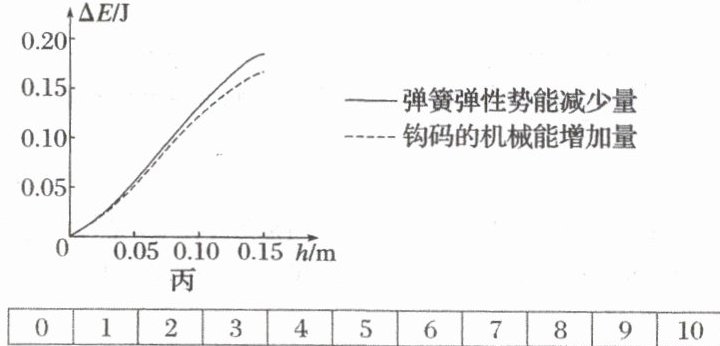 。(2)(4 分)利用计算机软件对实验数据进行处理,得到弹簧弹性势能减少量、钩码的机械能增加量分别与钩码上升高度 $ h $ 的关系,如图丙所示。由图丙可知,随着 $ h $ 增加,两条曲线在纵向的间隔逐渐变大,主要原因是________。