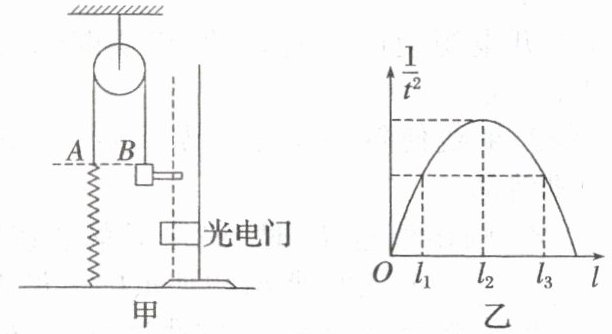 5. (8 分)(2025·湖北武汉市检测)某同学用如图甲所示的装置验证轻弹簧和小物块(带有遮光条)组成的系统机械能守恒。图中光电门安装在铁架台上且位置可调。物块释放前,细线与弹簧和物块的拴接点($ A $、$ B $)在同一水平线上,且弹簧处于原长。滑轮质量不计且滑轮凹槽中涂有润滑油,以保证细线与滑轮之间的摩擦可以忽略不计,细线始终伸直。小物块连同遮光条的总质量为 $ m $,弹簧的劲度系数为 $ k $,重力加速度为 $ g $,遮光条的宽度为 $ d $,小物块释放点与光电门之间的距离为 $ l $($ d $ 远远小于 $ l $)。已知弹簧的弹性势能表达式为 $ E_p = \frac{1}{2}kx^2 $,其中 $ k $ 为弹簧的劲度系数,$ x $ 为弹簧的形变量。现将小物块由静止释放,记录遮光条通过光电门的时间 $ t $。