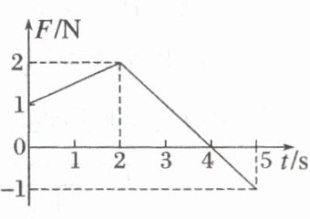 8.AD [$F - t$图像与$t$轴围成的面积表示拉力的冲量,根据动量定理可知$\frac{F_{1} + F_{2}}{2}t - \mu mgt = p$,代入数据可解得$p = 1\ kg \cdot m/s$,故A正确;同理,$2 \sim 4\ s$根据动量定理有$\frac{F_{2}}{2}t' - \mu mgt' = mv - p$,代入数据解得$v = 1\ m/s$,故B错误;由上述分析可知$0 \sim 2\ s$内物块动量的变化量大小为$1\ kg \cdot m/s$,$2 \sim 4\ s$内物块动量的变化量大小为$0$,$4 \sim 5\ s$内$F \leq 1\ N = \mu mg$,$F$与摩擦力同向,物块做匀减速运动直到静止,动量变化量大小为$1\ kg \cdot m/s$,所以在$0 \sim 2\ s$内和$2 \sim 5\ s$内,物块动量的变化量大小之比为$1:1$,故C错误;当拉力与摩擦力相等时,速度最大,由题图可知为$t = 3\ s$时刻,根据动量定理可知$\frac{F_{2} + F_{3}}{2}t'' - \mu mgt'' = mv' - p$,代入数据解得$v' = 1.5\ m/s$,故D正确。]