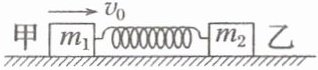 两端与质量分别为 $ m_1 $ 和 $ m_2 $ 的两物体甲、乙连接,静止在光滑的水平面上。现在使甲瞬间获得水平向右的速度 $ v_0 = 4\ m/s $,当甲物体的速度减小到 $ 1\ m/s $ 时,弹簧最短。下列说法中正确的是 (