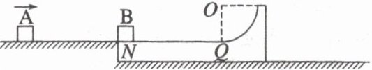 8. (16分)(2025·湖北宜昌市协作体期中)如图所示,紧靠在水平平台右端的长木板上表面NQ水平且与平台等高,NQ的长度$L = 2m$,长木板的右端为半径$R = 0.1m$的$\dfrac{1}{4}$光滑圆弧,可视为质点的滑块B静止在长木板的左端。质量$m_A = 1kg$的滑块A在光滑水平平台上以初速度$v_0 = 6m/s$向右匀速运动,一段时间后滑块A与滑块B发生弹性碰撞。已知滑块B的质量为$m_B = 3kg$,与NQ间的动摩擦因数$\mu = 0.1$,长木板的下表面光滑,重力加速度g取$10m/s^2$。