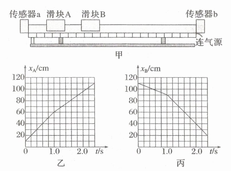 在第四次“天宫课堂”中,航天员演示了动量守恒实验。受此启发,某同学使用如图甲所示的装置进行了碰撞实验,气垫导轨两端分别安装 $ a $、$ b $ 两个位移传感器,$ a $ 测量滑块 $ A $ 与它的距离 $ x_{A} $,$ b $ 测量滑块 $ B $ 与它的距离 $ x_{B} $。部分实验步骤如下:
