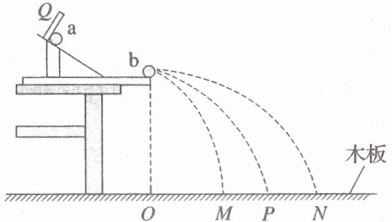 某同学用如图所示的装置验证动量守恒定律。将斜槽轨道固定在水平桌面上,轨道末段水平,右侧端点在水平木板上的垂直投影为 $ O $,木板上叠放着白纸和复写纸。实验时先将小球 $ a $ 从斜槽轨道上 $ Q $ 处由静止释放,$ a $ 从轨道右端水平飞出后落在木板上;重复多次,测出落点的平均位置 $ P $ 与 $ O $ 点的距离 $ x_{P} $。将与 $ a $ 半径相等的小球 $ b $ 置于轨道右侧端点,再将小球 $ a $ 从 $ Q $ 处由静止释放,两球碰撞后均落在木板上;重复多次,分别测出 $ a $、$ b $ 两球落点的平均位置 $ M $、$ N $ 与 $ O $ 点的距离 $ x_{M} $、$ x_{N} $。