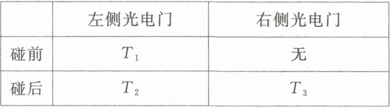 (2)由于碰前右侧光电门无示数,碰后两个光电门都有示数,所以两滑块碰撞后速度方向相反;滑块上遮光片宽度较小,因此可认为滑块挡光的平均速度近似等于其瞬时速度;设挡光片的宽度为$d$,以向右为正方向,根据动量守恒定律有$m_1\frac{d}{T_1}=-m_1\frac{d}{T_2}+m_2\frac{d}{T_3}$,即$\frac{m_1}{T_1}+\frac{m_1}{T_2}=\frac{m_2}{T_3}$,只要验证该式成立,即可验证两滑块组成的系统碰撞前后的总动量守恒;碰撞前系统的动能为$E_{k1}=\frac{1}{2}m_1(\frac{d}{T_1})^2$,
