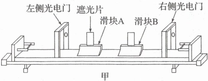验证动量守恒的实验可以在如图甲所示的气垫导轨上完成,其中左、右两侧的光电门可以记录遮光片通过光电门的挡光时间。实验前,测得滑块 $ A $(连同其上的遮光片)的总质量为 $ m_{1} $、滑块 $ B $(连同其上的遮光片)的总质量为 $ m_{2} $,两滑块上遮光片的宽度相同。实验时,开启气垫导轨气源的电源,轻轻拨动两滑块,两滑块在导轨上自由运动时近似为匀速运动,再让滑块 $ A $ 从导轨的左侧向右运动,穿过光电门与静止在两光电门之间的滑块 $ B $ 发生碰撞。