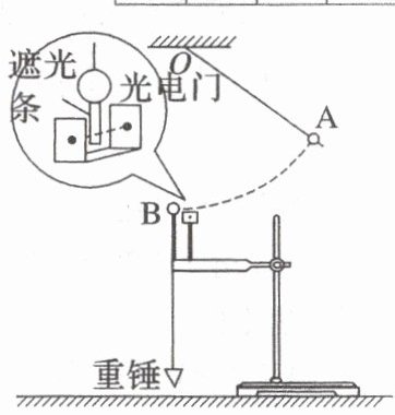 某同学设计了一个如图所示的实验装置来验证动量守恒定律。小球 $ A $ 底部竖直地粘住一片宽度为 $ d $ 的遮光条,用悬线悬挂在 $ O $ 点,光电门固定在 $ O $ 点正下方铁架台的托杆上,小球 $ B $ 放在竖直支撑杆上,杆下方悬挂一重锤,小球 $ A $(包含遮光条)和 $ B $ 的质量用天平测出分别为 $ m_{A} $、$ m_{B} $,拉起小球 $ A $ 使悬线偏离竖直线一定角度后释放,两小球碰撞前瞬间,遮光条刚好通过光电门,碰后小球 $ B $ 做平抛运动而落地,小球 $ A $ 反弹右摆,计时器的两次示数分别为 $ t_{1} $、$ t_{2} $,测量 $ O $ 点到 $ A $ 球球心的距离为 $ L $,小球 $ B $ 离地面的高度为 $ h $,小球 $ B $ 平抛的水平位移为 $ x $。