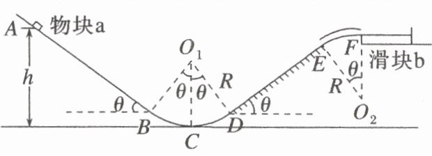 ②由几何关系可知,E点的高度$h_E = L\sin\theta + R(1 - \cos\theta) = 0.95m > h$,显然小物块a不会从E点滑出轨道DE。小物块a在DE上时,因为$\mu_2mg\cos\theta < mg\sin\theta$