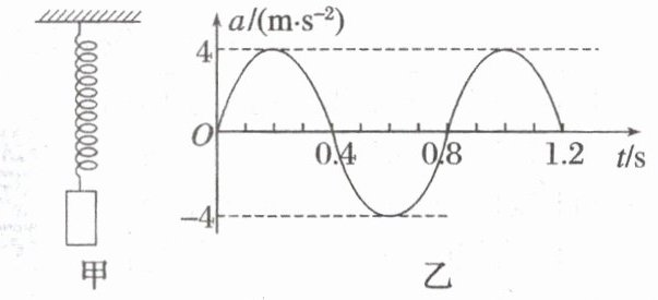 6.(2024·北京卷·9)图甲为用手机和轻弹簧制作的一个振动装置。手机加速度传感器记录了手机在竖直方向的振动情况,以向上为正方向,得到手机振动过程中加速度$a$随时间$t$变化的曲线为正弦曲线,如图乙所示。下列说法正确的是