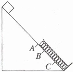 10.(2025·湖北襄阳市入学考)如图所示,一倾角为$45°$的光滑斜面固定在水平地面上,底端固定一轻质弹簧。将质量为$m$的物块(可视为质点)从斜面上由静止释放,物块在$A$点与弹簧接触,在$B$点时速度最大,在$C$点时,弹簧被压缩至最短。已知$AC=\frac{3\sqrt{2}mg}{2k}$,弹簧弹性势能为$E_p=\frac{1}{2}kx^2$,其中$x$是弹簧形变量,$k$为弹簧劲度系数。重力加速度为$g$,则下列说法正确的是
